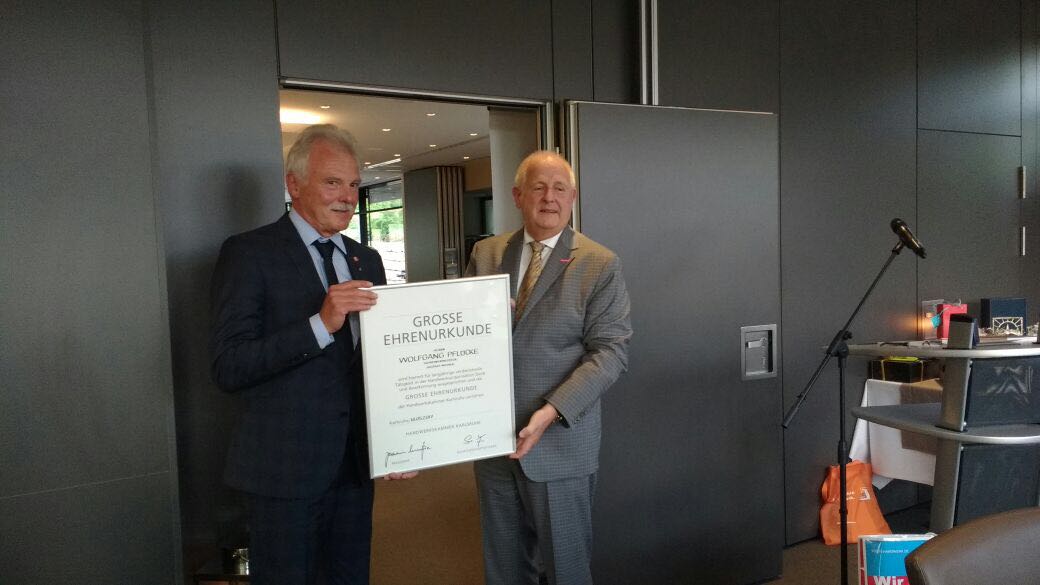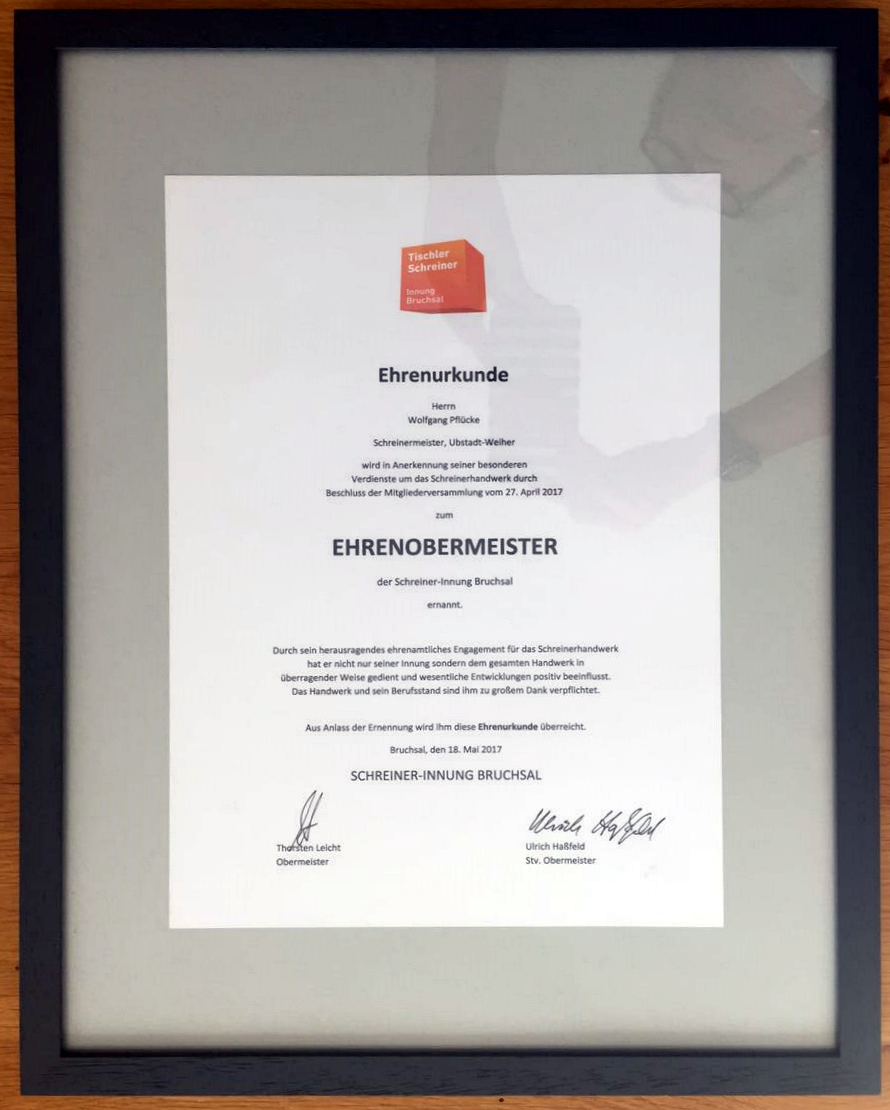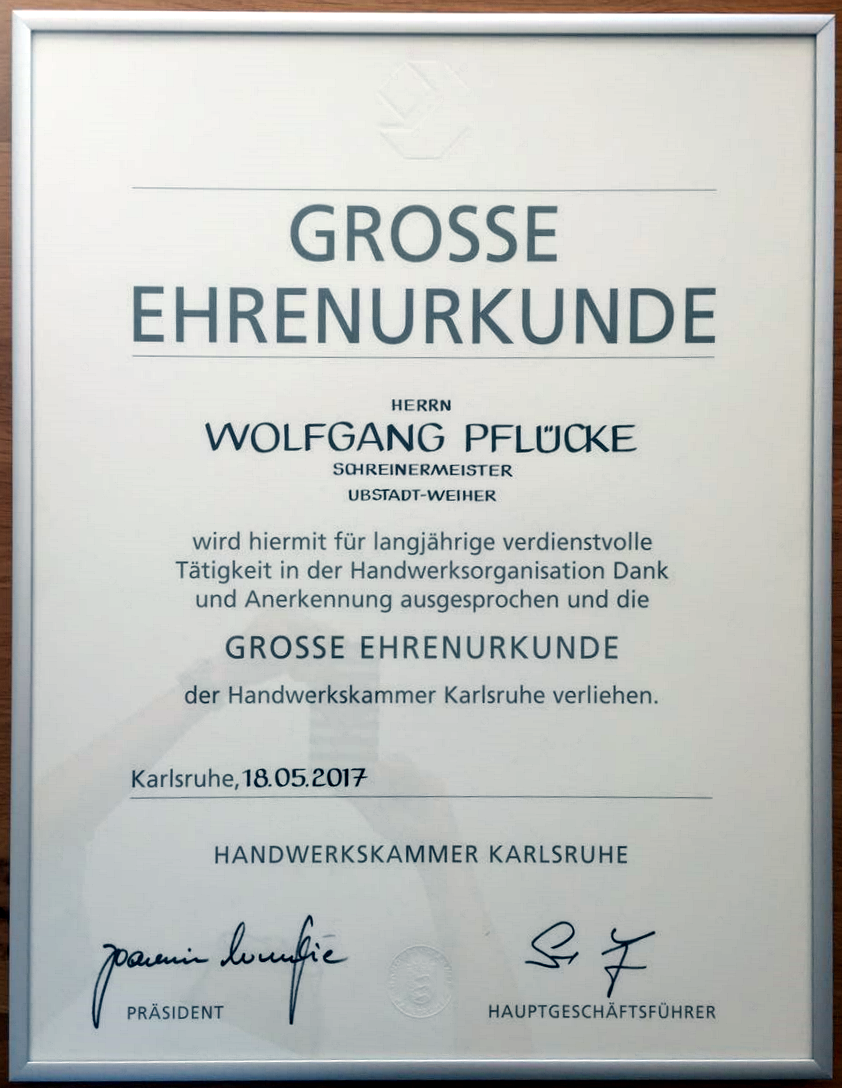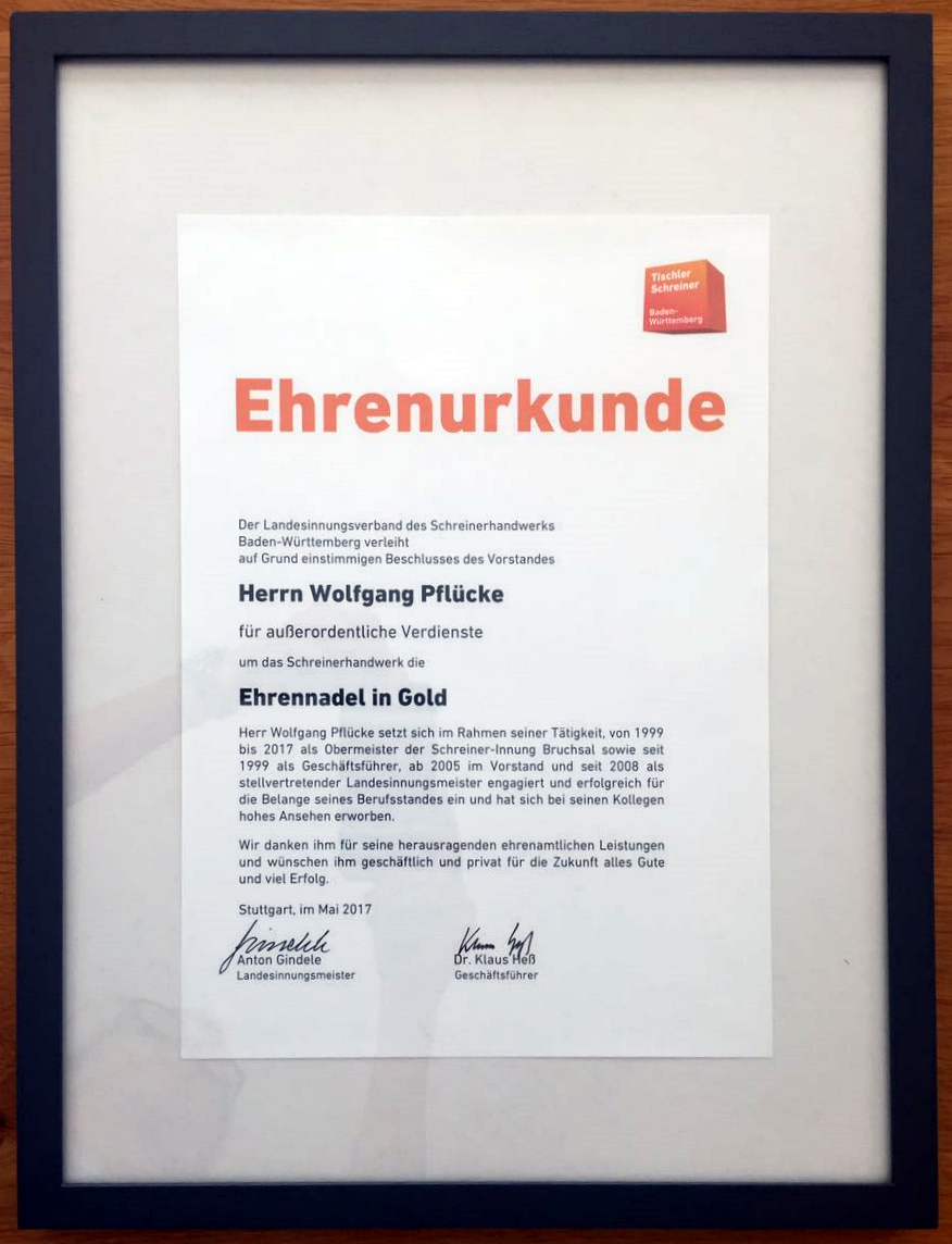 Die große Ehrenurkunde für den von allen wertgeschätzten „Teamplayer des Handwerks“ hatte ihm Joachim Wohlfeil, Präsident der Handwerkskammer Karlsruhe mitgebracht. Er hob die soziale Verantwortung für den Lehrling bis hin zum Meister hervor, die Pflücke im besonderen Maße auszeichnete. Ihm sei es gelungen, Jugendliche für das Schreinerhandwerk zu motivieren.