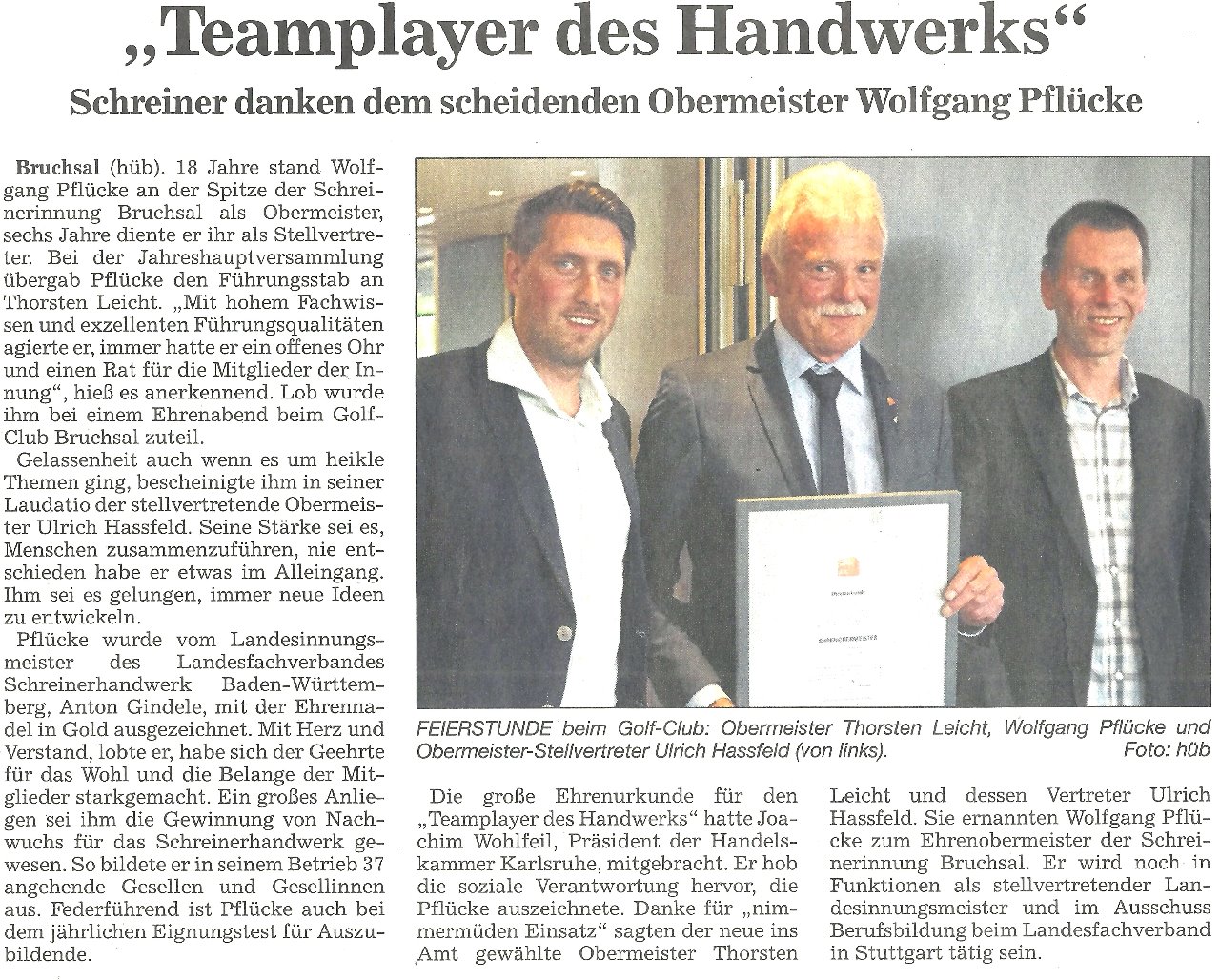 Achtzehn Jahre stand Wolfgang Pflücke an der Spitze der Schreinerinnung Bruchsal als Obermeister, sechs Jahre diente er ihr als Stellvertreter. Bei der Jahreshauptversammlung am 27. April übergab Wolfgang Pflücke den Führungsstab an Thorsten Leicht. Mit hohem Fachwissen und exzellenten Führungsqualitäten agierte er, immer hatte er ein offenes Ohr und einen Rat für die Mitglieder der Innung. Daher gebührten ihm Lob und Anerkennung für sein Wirken, die ihm bei einem Ehrenabend im Golf Club Bruchsal in hohem Maße zu teil wurden.