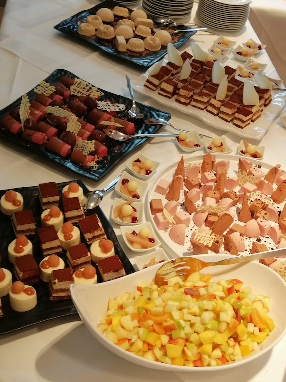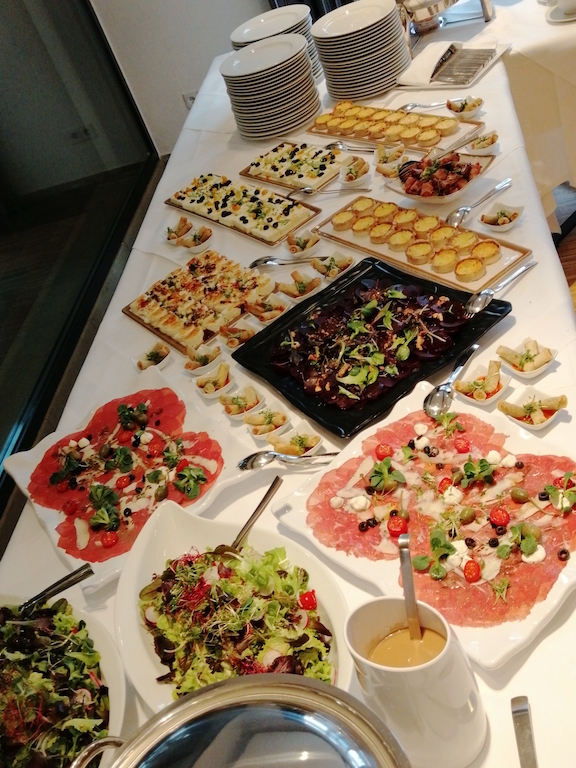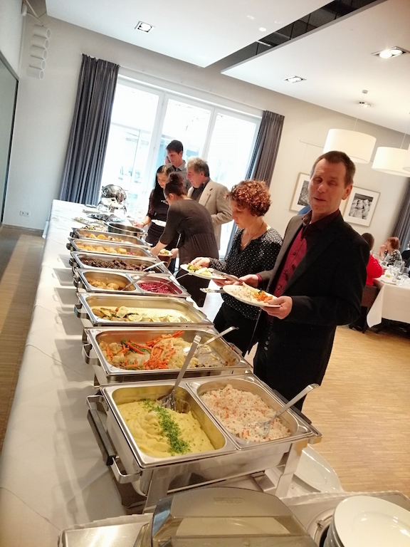 Anschließend wurde das reichhaltige Lunch-Buffet eröffnet: vom leckeren Vorspeisen-Buffet mit glasiertem Schafskäse, Frühlingsrollen mit Dip, Carpaccio, Salaten und kleinen Quiche bis hin zu einem deftigen Hauptspeisen-Buffet mit Ente, Wildschwein und Lachs.