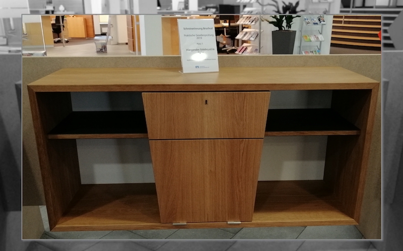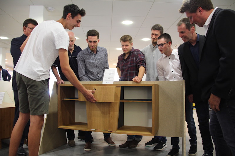1. Preisträger Lars Knopf präsentiert sein Hängendes Sideboard in Eiche
