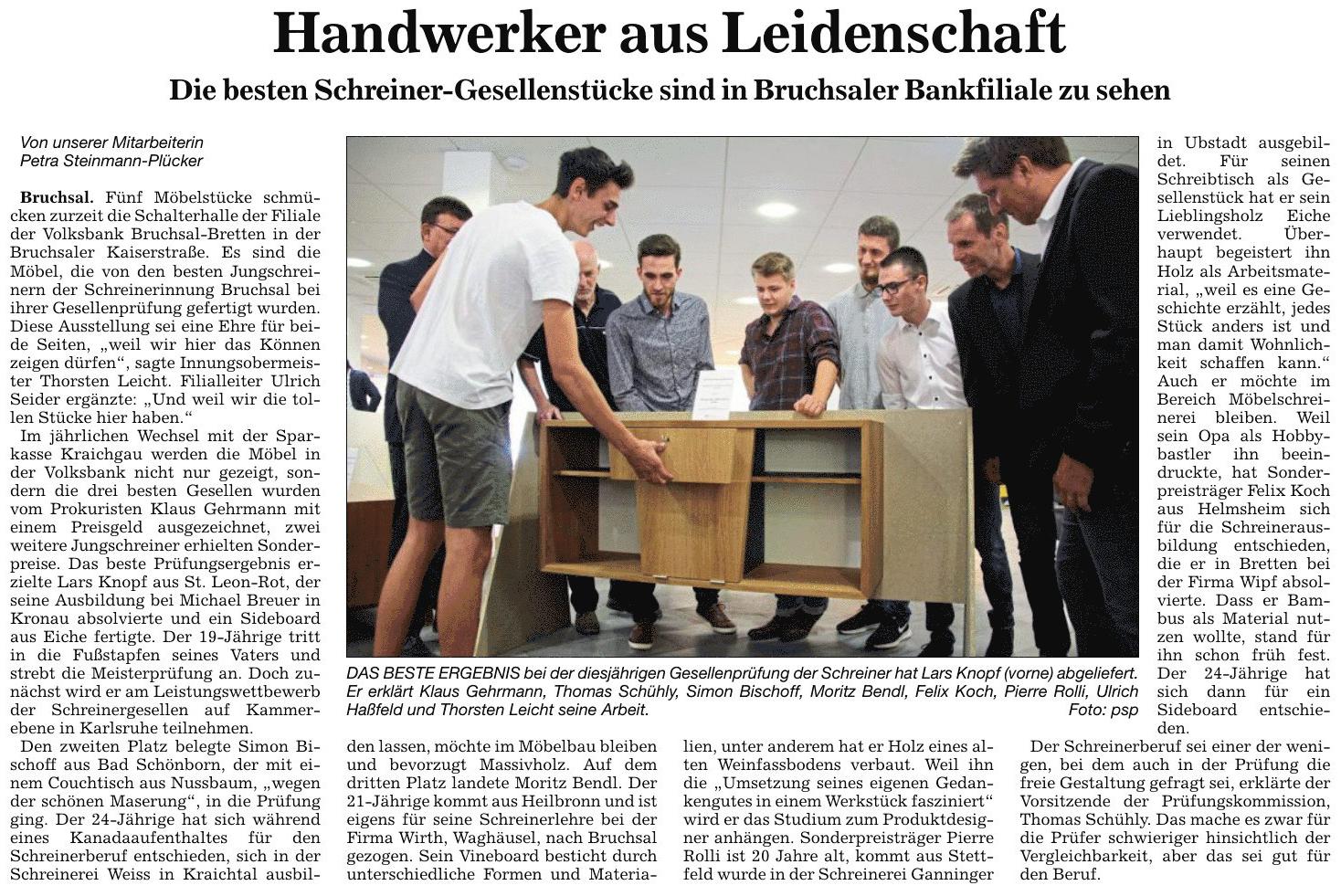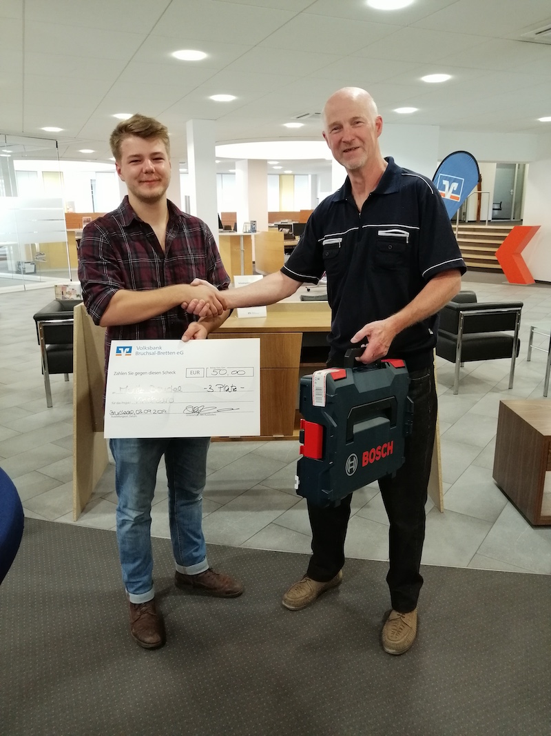Herzlichen Glückwunsch zur bestandenen Gesellenprüfung und ein großes Lob für die kreativen und ausgezeichneten Gesellenstücke. Die fünf besten Prüfungsstücke, welche die frischgebackenen Gesellen zur Preisverleihung stolz präsentierten, können in der Volksbank Bruchsal besichtigt werden.