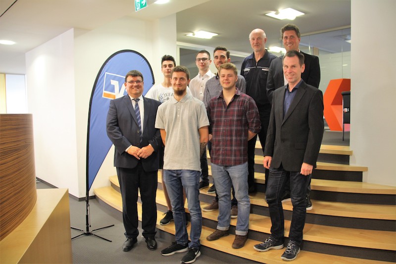 v.l.n.r. vordere Reihe: Klaus Gehrmann, Prokurist Volksbank Bruchsal Bretten, Felix Koch, Sonderpreisträger, Moritz Bendl, 2. Preisträger, Ulrich Haßfeld, Stv. Obermeister; hintere Reihe: Lars Knopf, 1. Preisträger, Pierre Rolli, Sonderpreisträger, Simon Bischoff, 2. Preisträger, Thomas Schühly, Gesellenprüfungsausschussvorsitzer, Thorsten Leicht, Obermeister