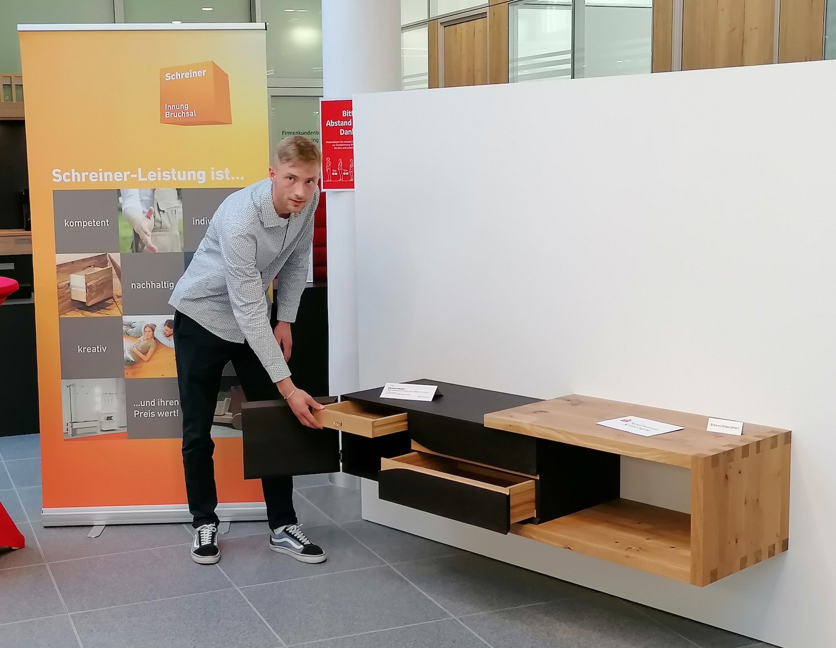 1.Preisträger Johannes Harrass präsentiert sein „Hänge-Sideboard in Eiche massiv, Korpus Räuchereiche furniert“