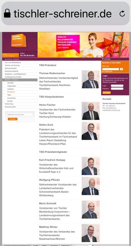 Außerdem beglückwünschen / gratulieren wir Herrn Heino Fischer (Vorsitzender des Fachverbandes Tischler Nord Hamburg/Schleswig-Holstein) und Herrn Stefan Zock (Präsident des Landesinnungsverbandes für das Tischlerhandwerk im Fachverband Leben Raum Gestaltung Hessen/Rheinland-Pfalz) zur Wahl zum neuen Vizepräsidenten. Und Herrn Karl-Friedrich Hodapp (Vorsitzender des Wirtschaftsverbandes Holz und Kunststoff Saar e.V./Saarland), Herrn Mario Schmidt (Vorsitzender von Tischler Mecklenburg-Vorpommern – Landesinnungsverband des Tischlerhandwerks) und Herrn Matthias Winter (Vorsitzender des Verbandes des Tischlerhandwerks Niedersachsen/Bremen) zur Wahl ins Präsidium.