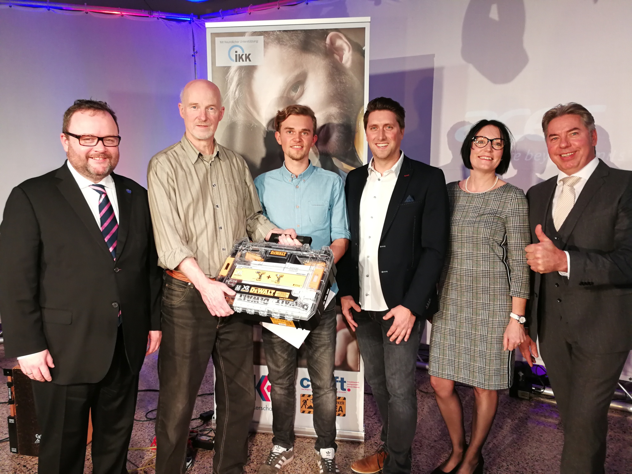 Jona Siegrist, 1. Innungssieger der Gesellenprüfung 2018, wurde für hervorragende Leistungen bei der Ausführung seines Gesellenstücks „wohnliches VW-Bus-Interieur“ geehrt. Obermeister Thorsten Leicht und Gesellenprüfungsvorsitzender Thomas Schühly überreichten dem vor Freude strahlenden 1. Platzierten einen Akkubohrschrauber – gesponsert von OPO Oeschger - und beglückwünschten ihn für seine außerordentliche Leistung. Die Preisübergabe fand im kleinen Kreis mit Herrn Dr. Christian Jung, FDP-Bundestagsabgeordneter für die Region Karlsruhe, und Herrn Frank Zöller, Kreishandwerksmeister, im Anschluss an die Freisprechungsfeier 2018 der Kreishandwerkerschaft Region Karlsruhe in der Balthasar-Neumann-Schule 1 in Bruchsal statt.